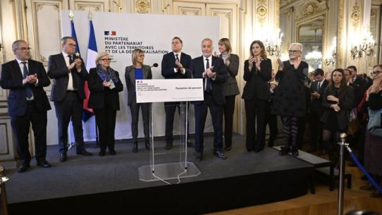 La passation de pouvoir entre les anciens et nouveaux ministres s'est déroulée ce mardi 24 décembre 2024 à l'hôtel de Roquelaure. Catherine Vautrin, ancienne ministre du Partenariat avec les territoires et de la Décentralisation, a remercié l'ensemble de son équipe et les agents du ministère avant de laisser la parole à François Rebsamen, nouveau ministre de l’Aménagement du territoire et de la Décentralisation ainsi qu'à Agnès Pannier-Runacher, ministre de la Transition écologique, de la Biodiversité, de la Forêt, de la Mer et de la Pêche.