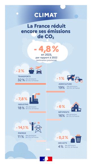 Selon les premières estimations du Citepa, les émissions françaises de CO2 enregistrent une baisse de 4,8 %, passant de 404 millions de tonnes équivalent CO2 en 2022 à 385 MtCO2e en 2023.