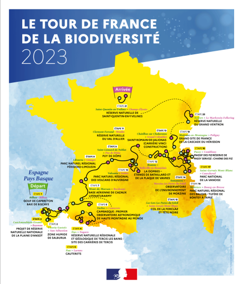 Transcription de l'image : Carte du Tour de France de la biodiversité 2023