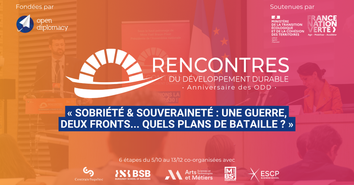 L’édition 2023 des Rencontres du Développement Durable sera lancée les 5 et 6 octobre, à Paris sur le thème : « Sobriété & Souveraineté : une guerre, deux fronts... Quels plans de bataille ? ». Organisé par l’Institut Open Diplomacy en partenariat avec le ministère de la Transition écologique et de la Cohésion des territoires et France Nation Verte, ce rendez-vous gratuit est ouvert au plus grand nombre !