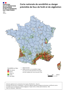C’est dans ce cadre que le ministère de la Transition écologique et de la Cohésion des territoires a réalisé une carte nationale de sensibilité aux feux de forêt et de végétation. Établie à partir d’une méthode mathématique et probabiliste et d’outils d’intelligence artificielle, la carte intègre les informations d’images satellitaires décrivant la végétation (type et état de la végétation), l’occupation des sols par des équipements susceptibles d’être à l’origine d’un feu par une probabilité plus forte (infrastructures de transport, lignes électriques aériennes, bâti) ainsi que de données décrivant le climat et le relief. Elle reflète la probabilité que le territoire soit touché par un feu de forêt ou de végétation de plus de 20 hectares.