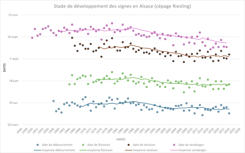 Les dates des principaux stades de développement de la vigne en Alsace n’avaient pas évolué de manière significative jusqu’au début des années 1980. Depuis cette période, les dates de débourrement et de floraison ont avancé d’environ 15 jours, celle de véraison d’environ 23 jours.