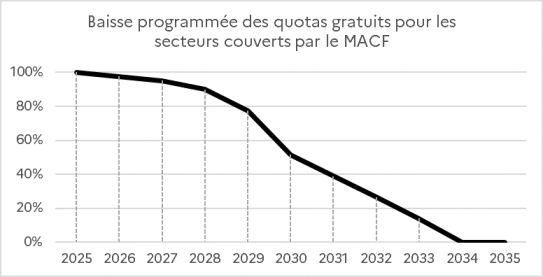 La montée en charge du MACF est donc indissociable de la disparition progressive des quotas gratuits dans le SEQE-UE (i.e. le marché carbone européen). C’est pour cette raison que le règlement MACF et la révision de la directive ETS ont dû être négociés conjointement au niveau européen.