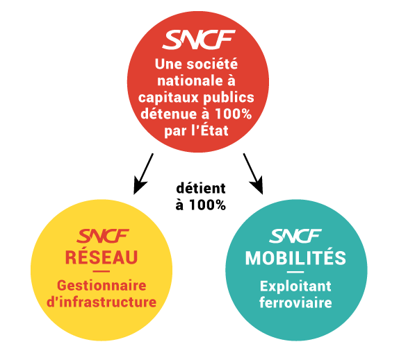 La SNCF reste une société nationale à capitaux publics détenue à 100% par l'État. Elle détient à 100% :