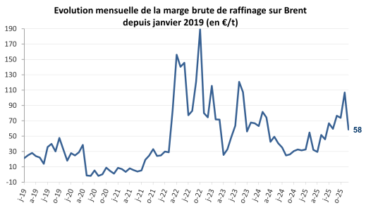 Cette marge « théorique » est un indicateur illustrant en tendance l’environnement économique du raffinage et diffère de la marge réelle de chaque raffinerie française.