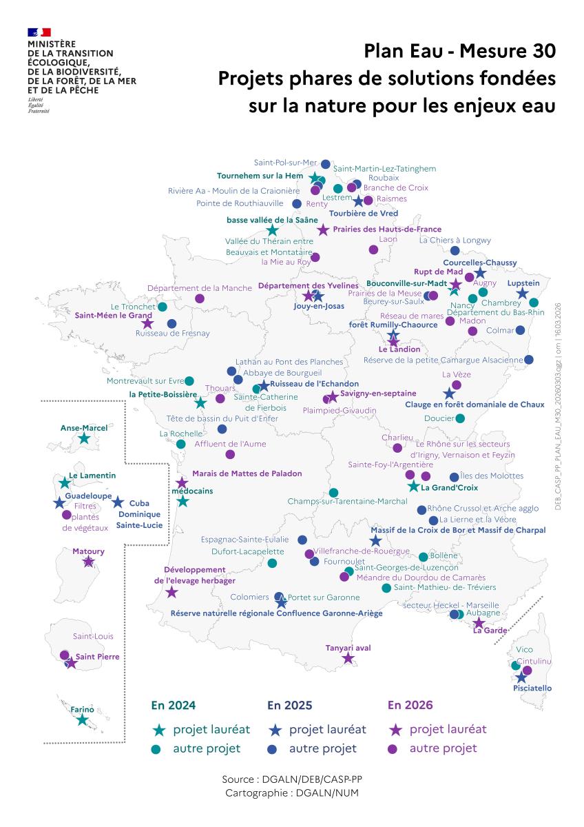 Le Plan eau (mesure 30) prévoit de labelliser « Solutions fondées sur la nature » 70 opérations phares (10 par grand bassin hydrographique). Les projets concernent la lutte contre les sécheresses et les inondations ou l’approvisionnement en eau (quantité et qualité).