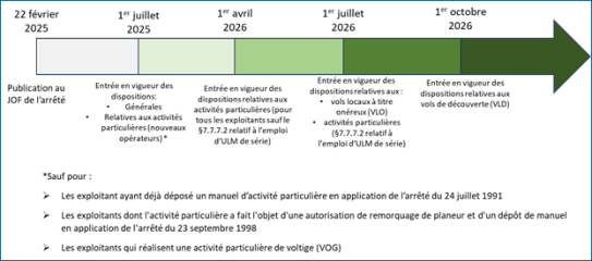 De manière plus générale la phase d’entrée en vigueur des nouvelles exigences de l’arrêté OPS-ULM se fera selon le calendrier suivant :