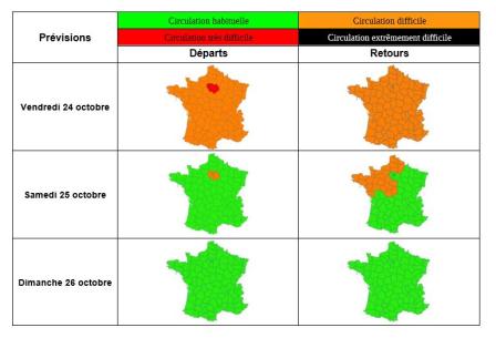 Bison Futé - Prévisions nationales de circulation du vendredi 24 au dimanche 26 octobre 2025