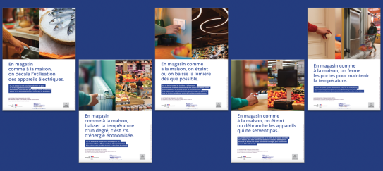 Le Gouvernement et le groupe de travail mené par Perifem ont conçu et produit 5 visuels (voir en annexe) communs qui seront adaptés et diffusés par les enseignes dans différents formats : en affichage papier, pour être intégrés dans des catalogues ou prospectus, pour les réseaux sociaux... Tous les signataires de la charte d’utilisation y ont accès librement.